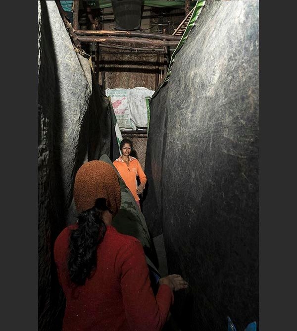 The rooms are dimly lit and have just one tube light. Practically everybody in this farm has learnt to work in the dark. While I was pondering over this I heard a voice call out my name. I squinted my eyes to find Karthik and saw him perched on the ledge below the roof, trying to spread a huge tarpaulin on the top.“When temperatures drop to single digits we are on our toes, literally,” he said, balancing himself on the bamboo ledge trying to tuck the tarpaulin by harnessing it around the bamboo support. I was impressed straightaway with what was going on there and it occurred to me that I should do a story about this.