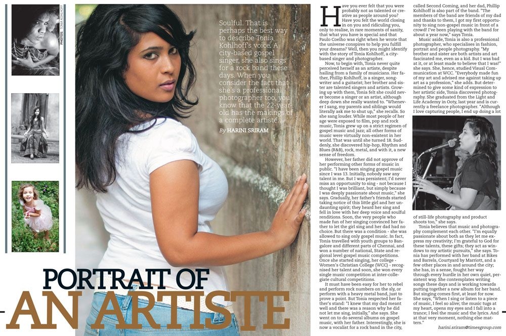 Soulful. That is perhaps the best way to describe Tonia Kohlhoff’s voice. A City-based gospel singer, she also sings for a rock band these days. When you consider the fact that she’s professional photographer too, you know that the 22-year-old has the makings of a complete artiste…